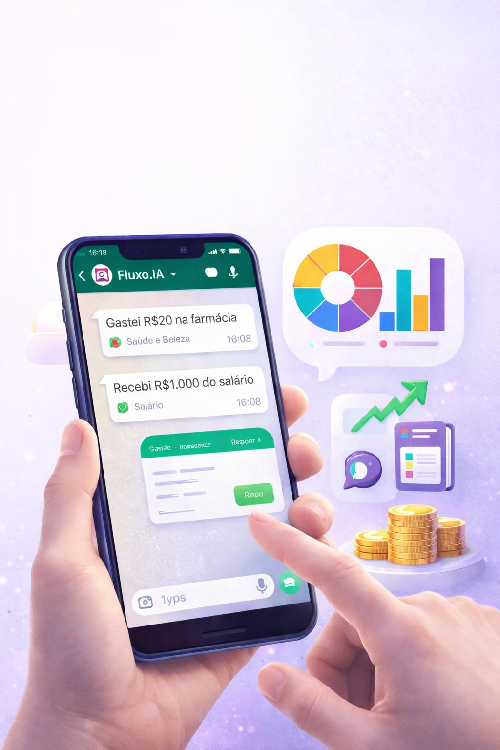 Envie mensagens como 'Gastei R$20 na farmácia' ou 'recebi R$1.000 do salário', e ela registra e categoriza automaticamente. Você recebe lembretes, gráficos e relatórios inteligentes para acompanhar cada gasto e receita sem complicação.